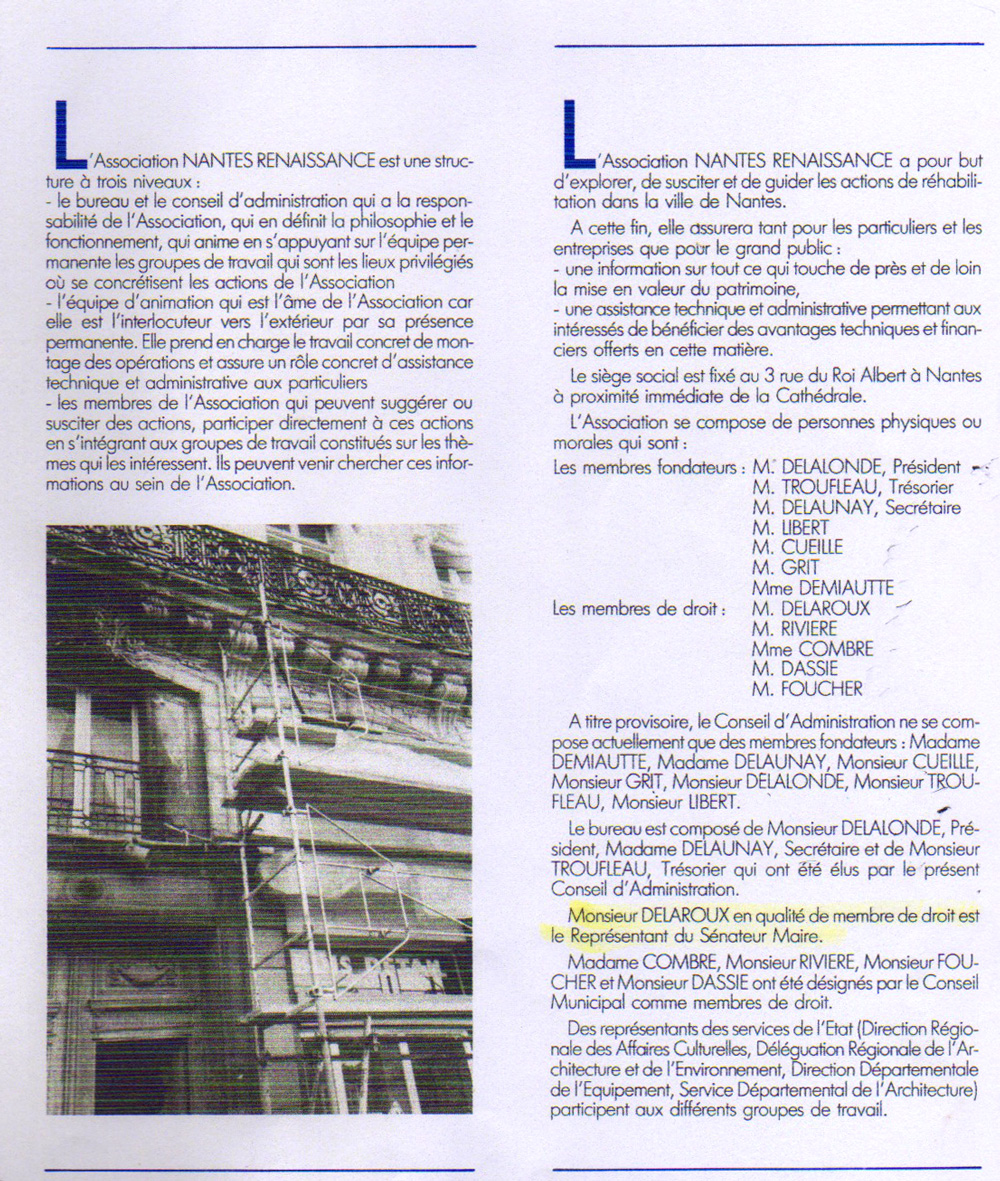 Vincent Delaroux est désigné représentant du Maire de Nantes dans l’association. Il prend seulement le poste de Vice-Président « Pour ne pas être juge et partie » et conserver une part d’autonomie. Environ 18 personnes siègent au Conseil d’administration présidé par Eric Delalonde puis par Gérard Troufleau, ancien Directeur Régional des Services Fiscaux. L’association comptera jusqu’à 300 Adhérents. Lire article : Ravalement de façade et vie de l’association