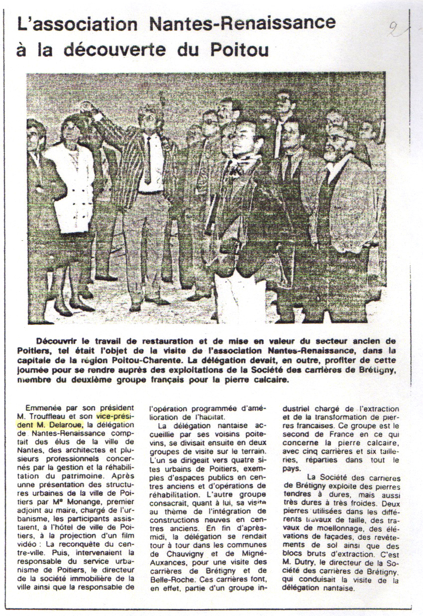 Les villes voisines, Rennes, Poitiers, Angers avaient déjà pris le problème de la valorisation du patrimoine à bras-le-corps. Plusieurs voyages d’études et de découvertes ont été organisés afin de s’inspirer de leurs expériences.Lire articles : Nantes-Renaissance à Angers, à la pêche aux idées ; une confrontation enrichissante ; L’assemblée générale des renaissances des cités ; des élus nantais à la découverte de l’expérience de Rennes ; L’association Nantes-Renaissance à la découverte du Poitou