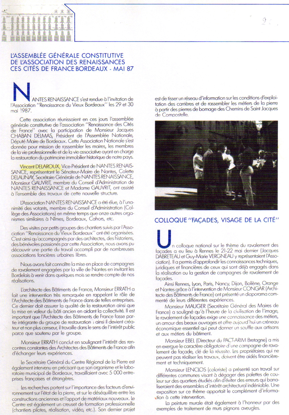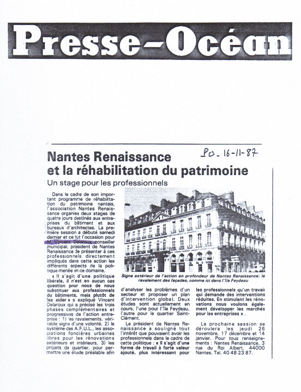 La décision de créer une association est rapidement entérinée. Cette association, dont l’objet est de valoriser et réhabiliter le secteur sauvegardé (Nantes-R 2 et Nantes-R 3) de Nantes, soit 135 hectares, se nommera « Nantes-Renaissance ». Lire articles : L’association Nantes Renaissance ; Au pied de la façade