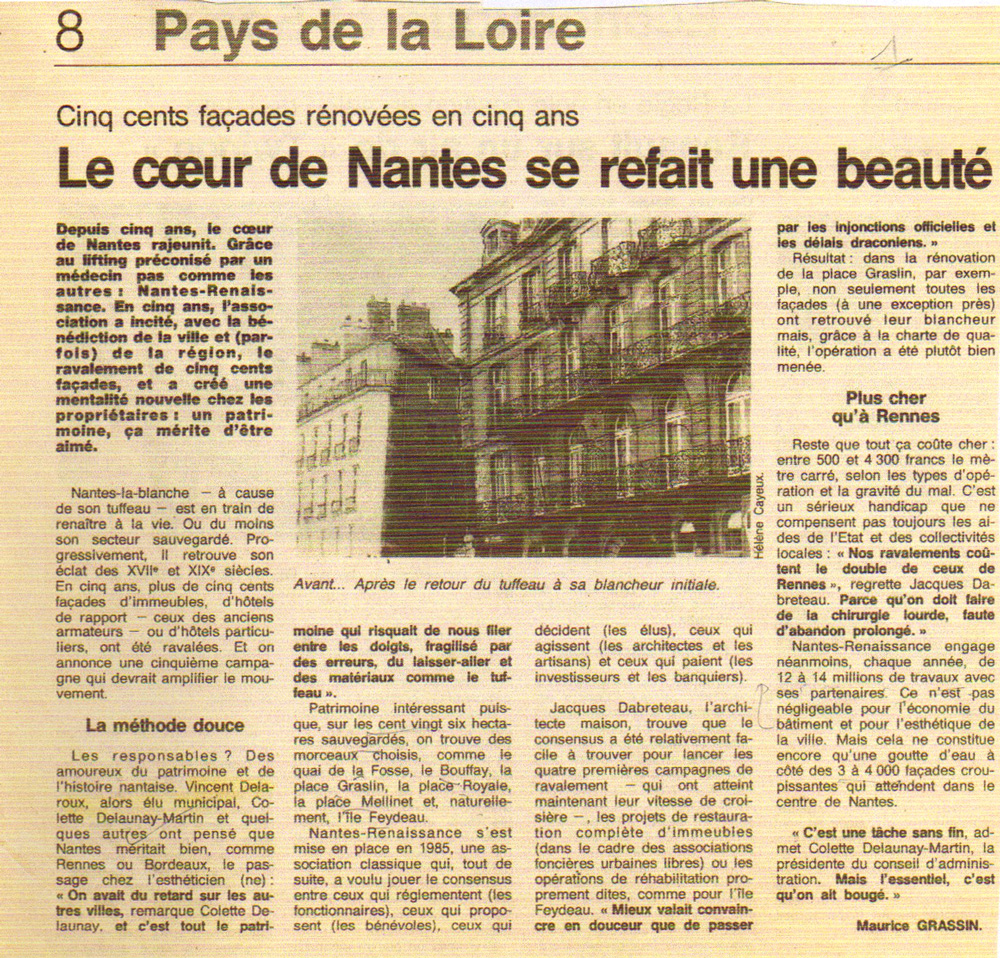 Grâce aux actions menées dans le cadre de Nantes-Renaissance, Nantes la Grise a disparu… laissant place à Nantes la Blanche au cœur de ville lumineux. Lire article : le cœur de Nantes se refait une beauté ; Nantes des habits neufs pour la ville.