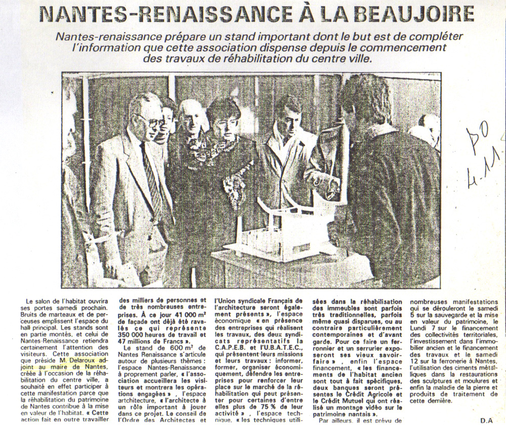 - Diffuser une information sur tout ce qui touche de près ou de loin la mise en valeur du patrimoine. Une des meilleures illustrations de cet objectif, reste, le stand tenu par Nantes-Renaissance, lors du salon de l’habitat à la Beaujoire. Lire article : Nantes-Renaissance à la Beaujoire